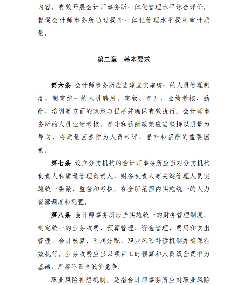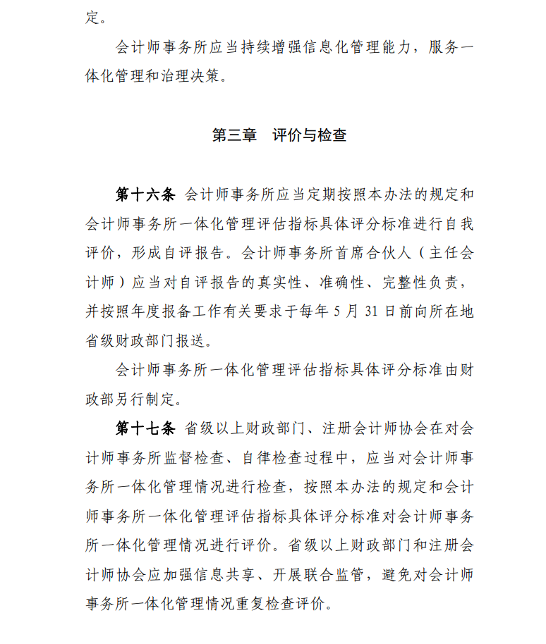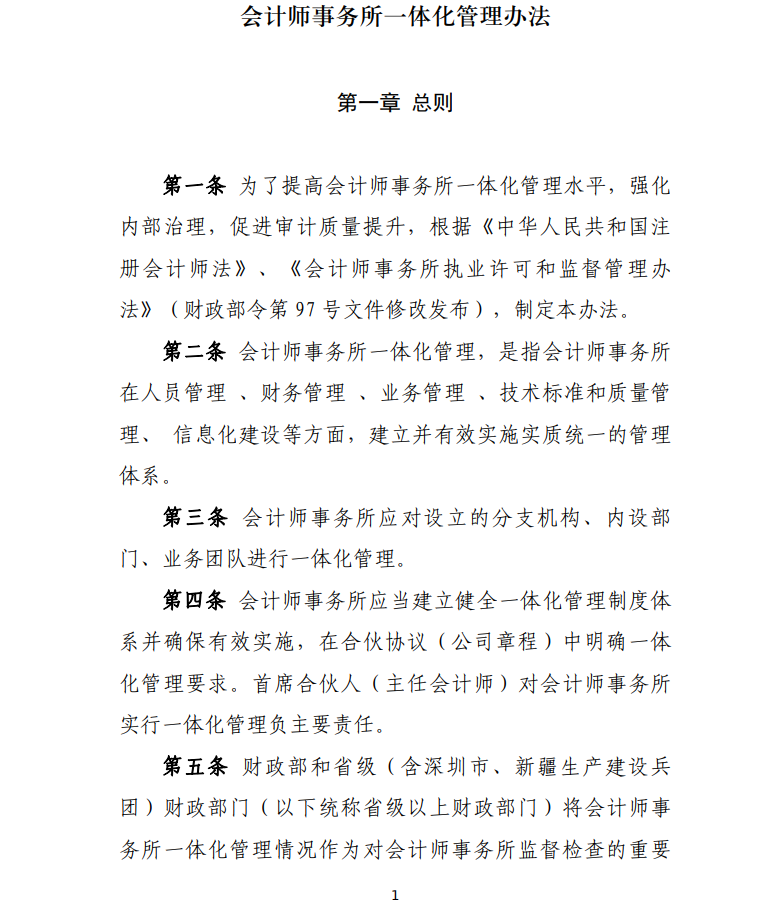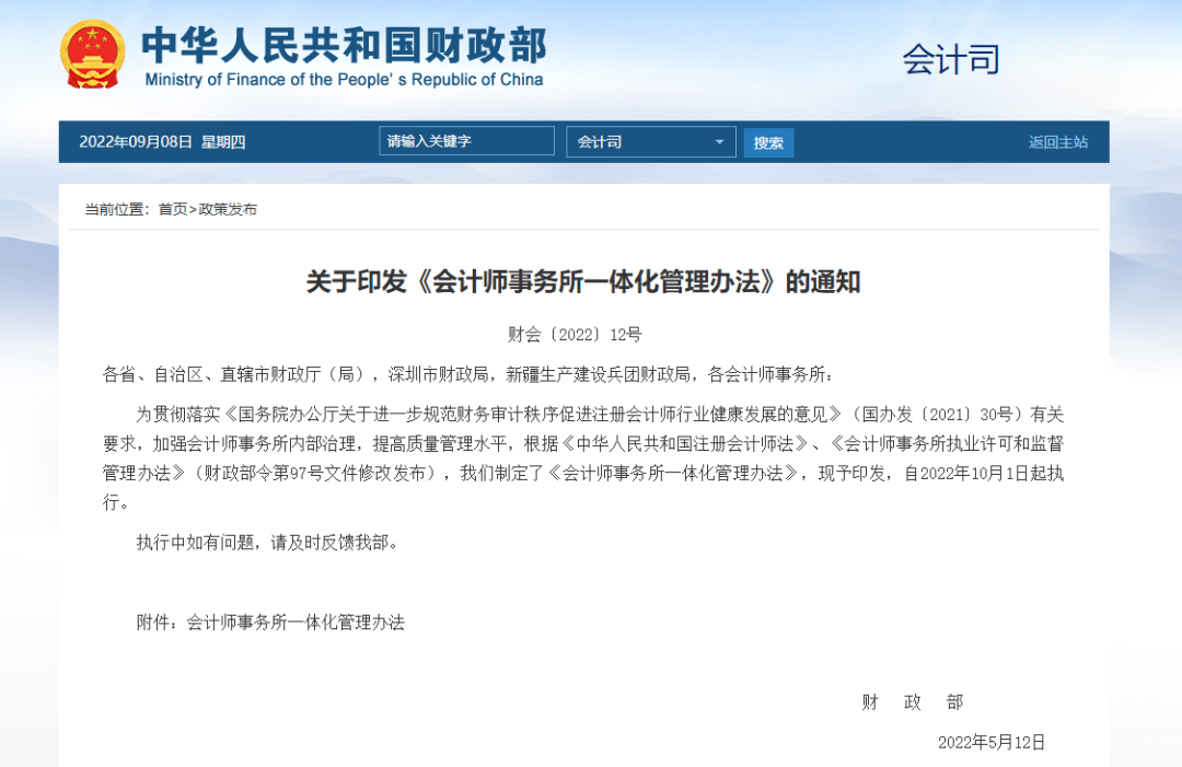 為貫徹落實《國務院辦公廳關于進一步規范財務審計秩序促進注冊會計師行業健康發展的意見》(國辦發〔2021〕30號)有關要求,加強會計師事務所內部治理,提高質量管理水平,根據《中華人民共和國注冊會計師法》、《會計師事務所執業許可和監督管理辦法》(財政部令第97號文件修改發布),我們制定了《會計師事務所一體化管理辦法》,現予印發,自2022年10月1日起執行。