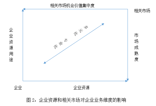 當(dāng)前我國城建領(lǐng)域市場成熟度較低,市場價(jià)值集中度不高,比較適合進(jìn)行多元化經(jīng)營。另外,企業(yè)的資源能力也決定了企業(yè)從事某項(xiàng)業(yè)務(wù)所可能實(shí)現(xiàn)的價(jià)值,企業(yè)在某項(xiàng)業(yè)務(wù)上的資源能力越強(qiáng),說明企業(yè)在這項(xiàng)業(yè)務(wù)上的相對能力就較強(qiáng)。城投公司的多元化維度和規(guī)模主要由這兩種因素決定,如圖2所示: