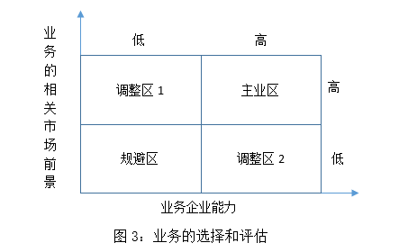 在調(diào)整區(qū)2中,城投公司在該業(yè)務(wù)上能力較強(qiáng),但潛在的市場空間卻有限,公司也應(yīng)當(dāng)做出調(diào)整;如果集中資源能夠搶占競爭對手的市場,則應(yīng)積極進(jìn)入該業(yè)務(wù)領(lǐng)域,否則看這種能力是否能夠轉(zhuǎn)移,如果不能轉(zhuǎn)移,在盈利的情況下繼續(xù)經(jīng)營。