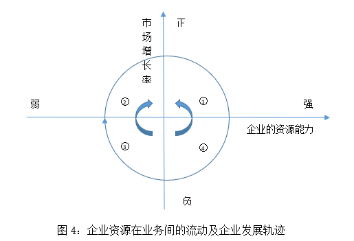 業(yè)務(wù)開始都是企業(yè)資源能力較弱,市場增長率很強(qiáng),企業(yè)會注入資源;然后業(yè)務(wù)的企業(yè)能力變強(qiáng),市場增長率會很高,企業(yè)繼續(xù)投入資源。但過了高增長期之后,該業(yè)務(wù)的增長率會降低,降低的原因是由于市場競爭者增多導(dǎo)致的。如果企業(yè)處于比較劣勢的地位,那么業(yè)務(wù)就會處于負(fù)增長,企業(yè)就應(yīng)從中抽取資源投入有潛力或增長趨勢正強(qiáng)勁的業(yè)務(wù)。該業(yè)務(wù)的企業(yè)能力隨著資源的逐漸減少,業(yè)務(wù)能力弱化,企業(yè)進(jìn)入第三象限,直至該業(yè)務(wù)消亡。