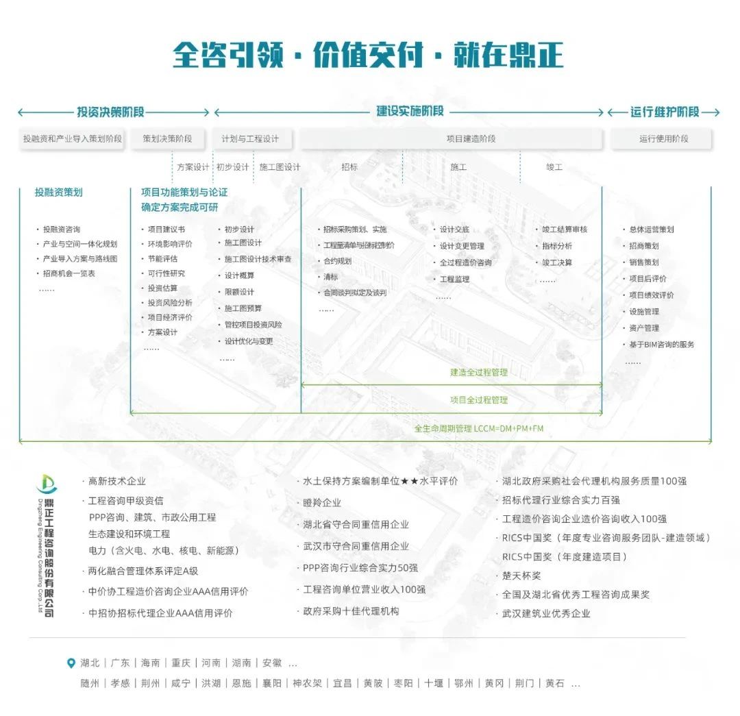 鼎正業務涵蓋設計咨詢產業鏈及工程產品產業鏈,既包括居住建筑、公共建筑、工業建筑等建筑設計領域,市政排水設計、市政道路設計等市政設計領域及景觀綠化設計領域,也包括全過程工程咨詢、全過程產業咨詢、投融資咨詢、項目管理、造價咨詢、造價與法律糾紛咨詢、招標代理等工程投資、造價、運營等業務。