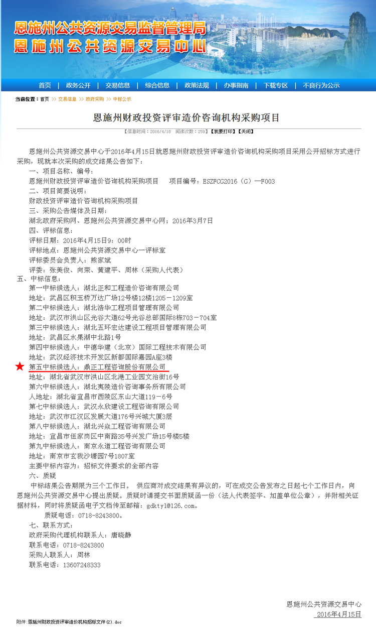 【經營成果】我司中標恩施州財政投資評審造價咨詢機構采購項目