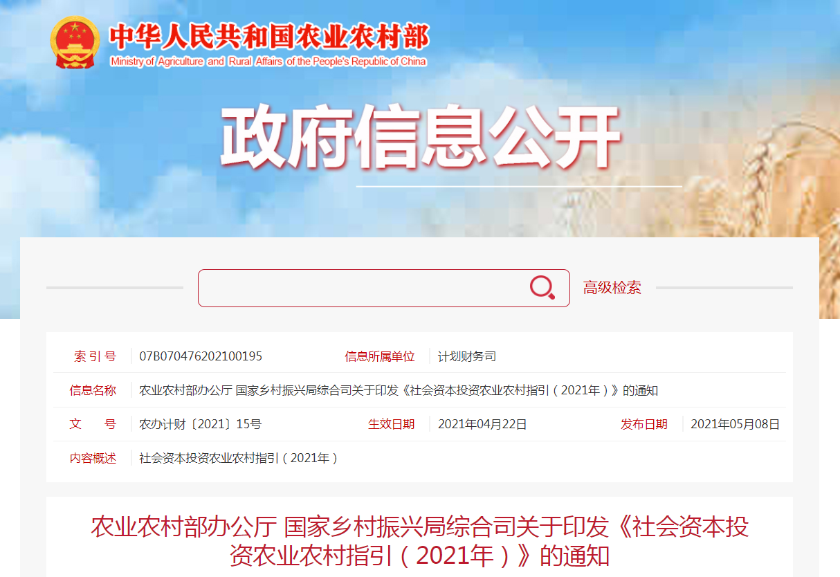 社會資本投資農業農村指引(2021年)