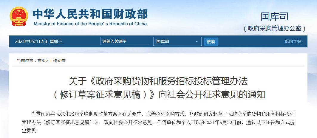 為貫徹落實《深化政府采購制度改革方案》有關要求,完善招標采購方式,財政部研究起草了《政府采購貨物和服務招標投標管理辦法(修訂草案征求意見稿)》,現向社會公開征求意見。任何單位和個人可以在2021年5月30日前,通過以下途徑和方式提出意見:
