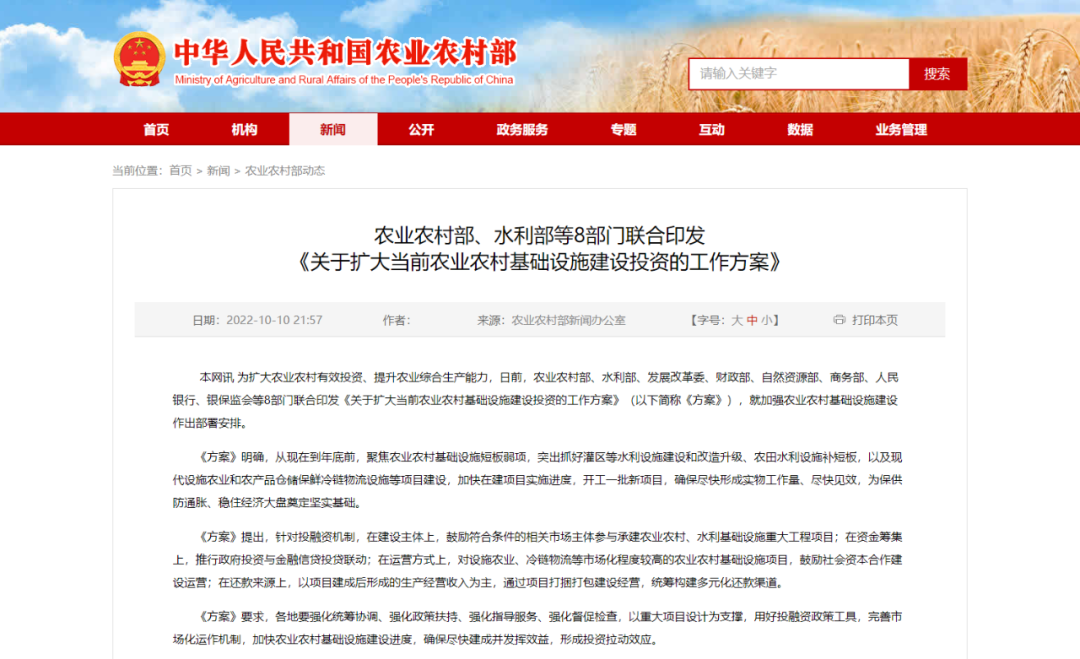 八大部門聯合印發:《關于擴大當前農業農村基礎設施建設投資的工作方案》