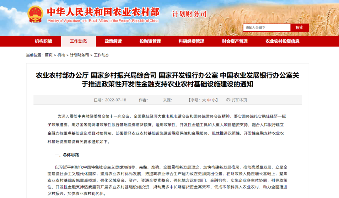 為深入貫徹中央財經委員會第十一次會議、全國穩住經濟大盤電視電話會議和國務院常務會議精神,落實國務院扎實穩住經濟一攬子政策措施,用好國務院調增政策性銀行基礎設施信貸額度,運用政策性、開發性金融工具加大重大項目融資支持,配合人民銀行建立金融支持重點基礎設施項目對接機制,部署做好農業農村基礎設施建設融資保障和金融服務,現就推進政策性、開發性金融支持農業農村基礎設施建設有關要求通知如下。