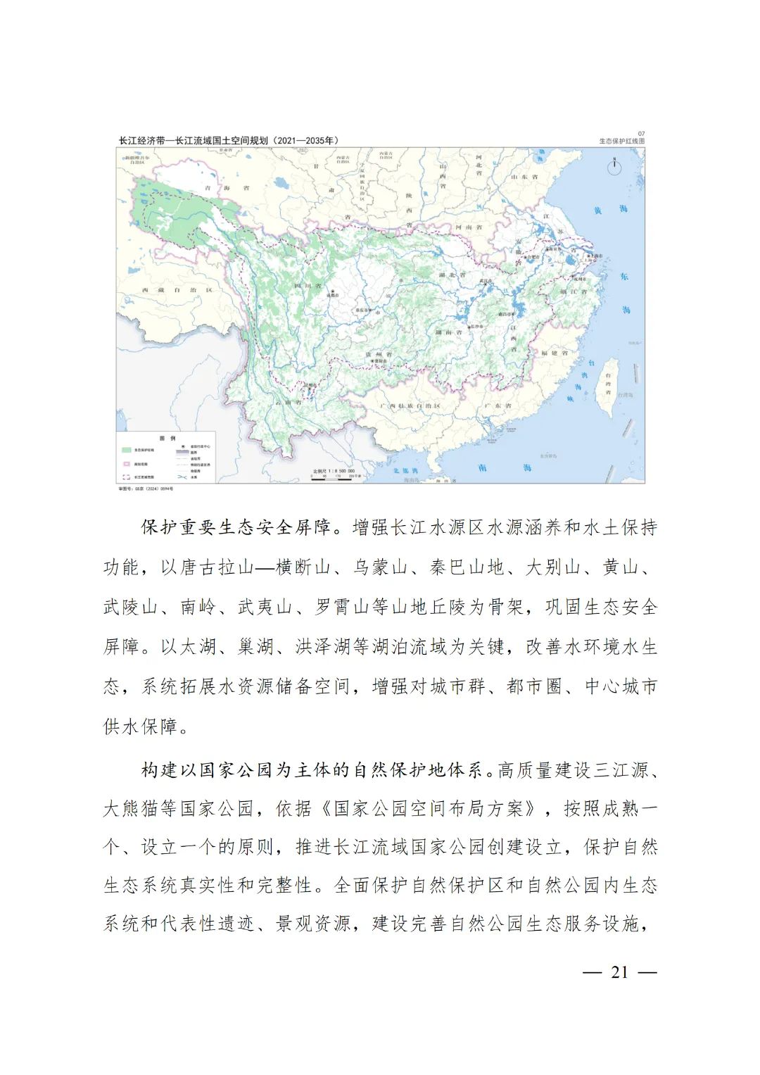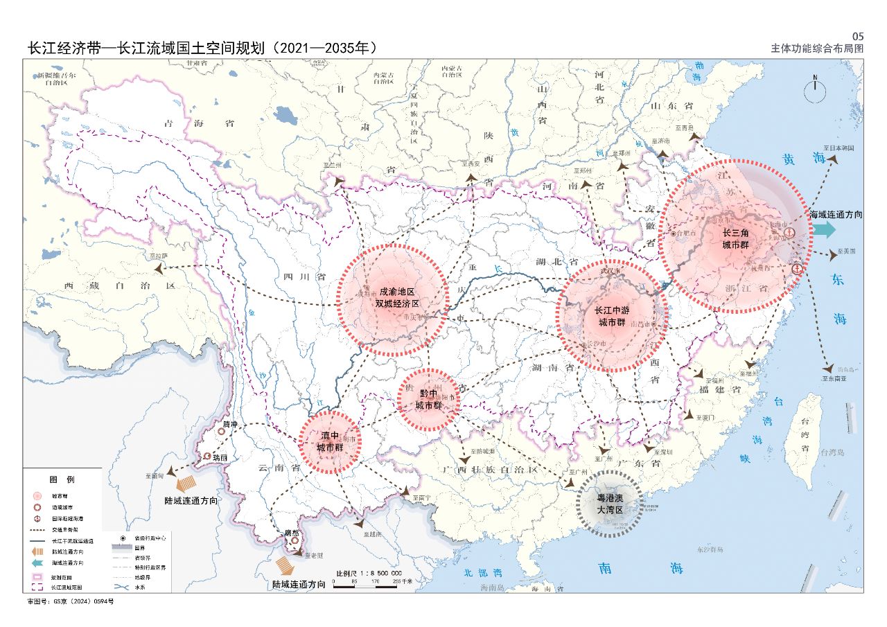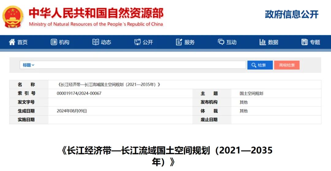 2024年2月9日,《長江經濟帶—長江流域國土空間規劃(2021—2035年)》經國務院批復同意。9月10日,自然資源部正式印發《長江經濟帶—長江流域國土空間規劃(2021—2035年)》。規劃范圍包括長江經濟帶11個省(市)全域,以及《長江保護法》規定的長江流域其他8?。▍^、市)的相關縣級行政區域,共計1173個縣級行政區域。規劃范圍包括陸域國土和內水、領海。其中,陸域面積240萬平方公里。(后附規劃范圍詳細表格)規劃期限為2021年至2035年。