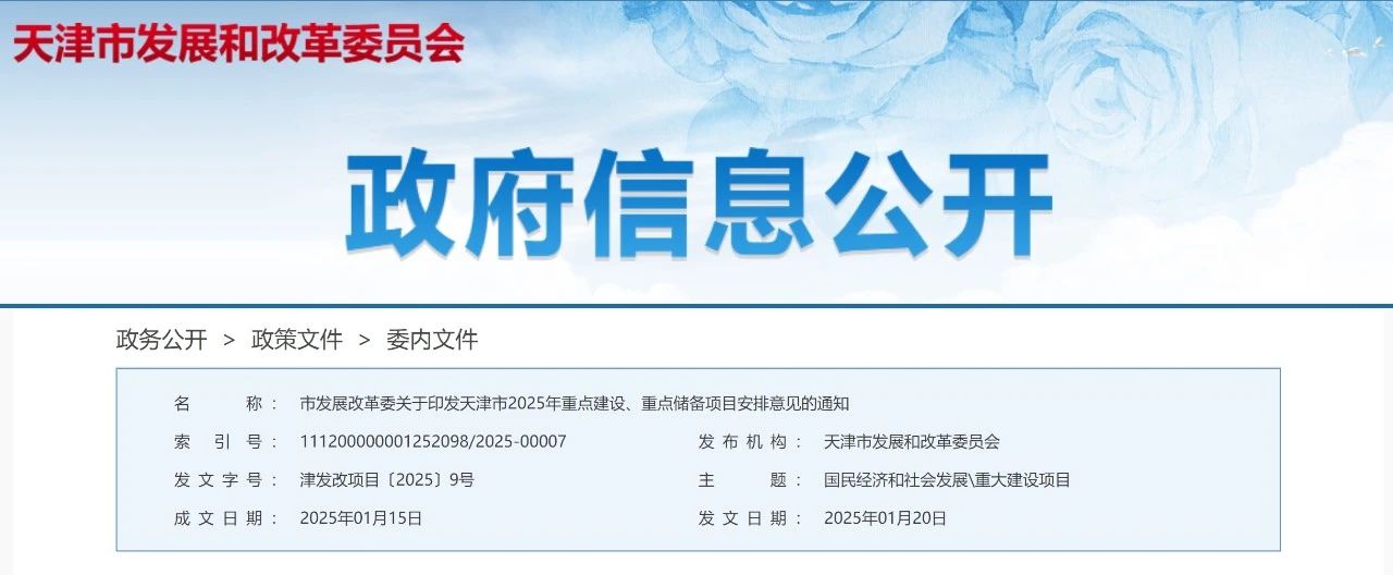 天津市發展改革委發布2025年重點建設、重點儲備項目安排意見,共計1129個項目、總投資2.02萬億元。其中,包括重點建設項目854個,總投資1.52萬億元,年度計劃投資2209.07億元,均為在建續建或即將開工項目;重點儲備項目275個,總投資4992.26億元。