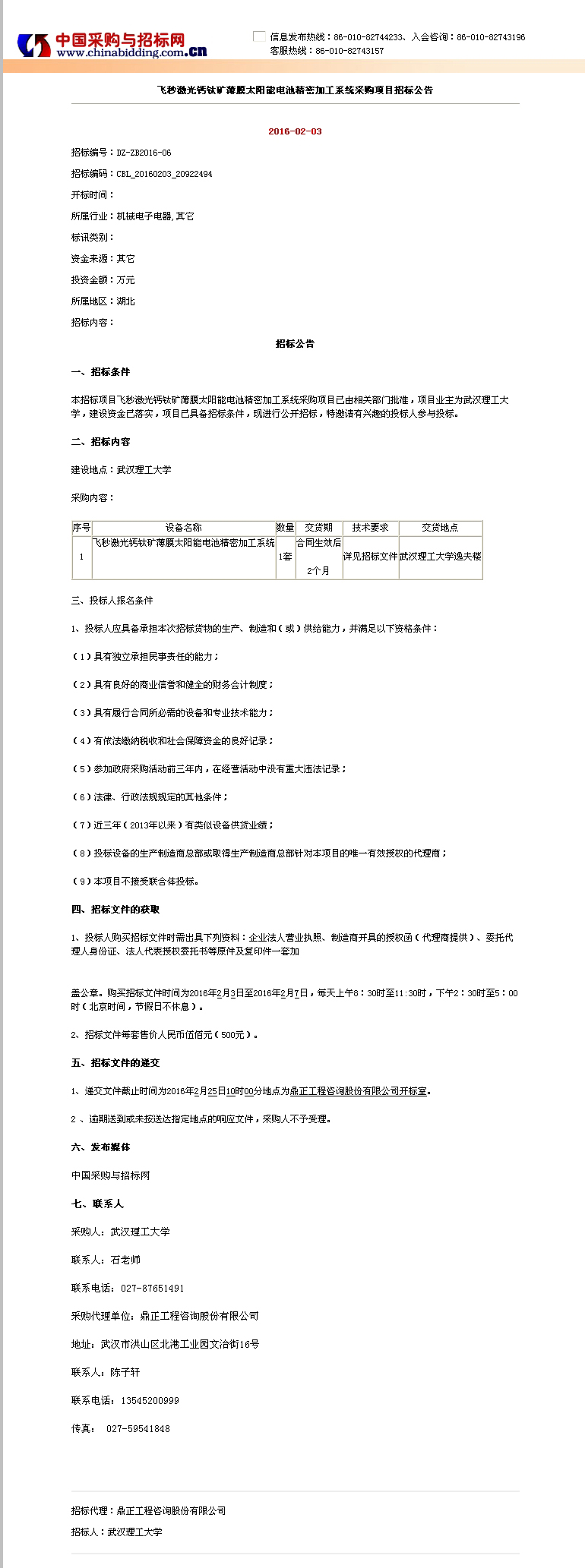 飛秒激光鈣鈦礦薄膜太陽能電池精密加工系統采購項目招標公告
