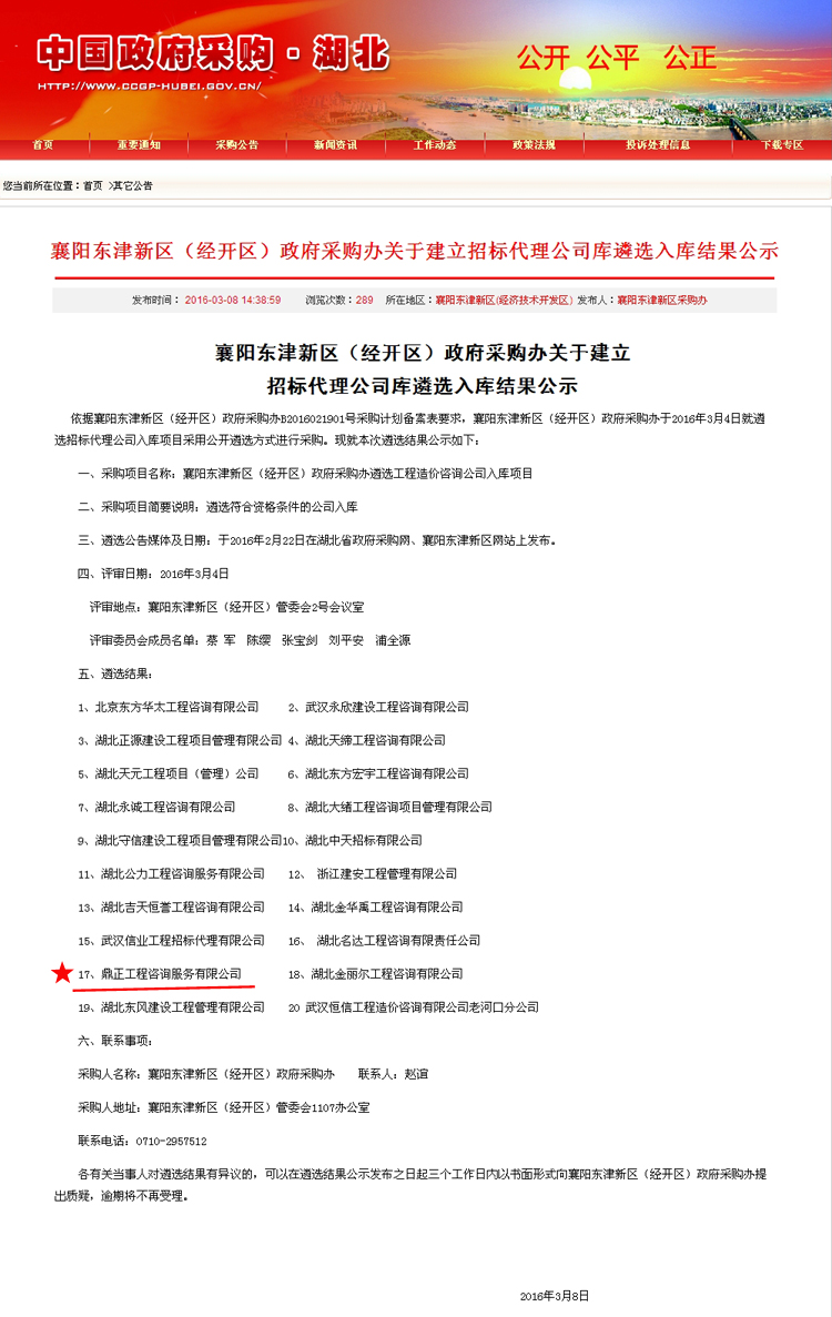 【經(jīng)營成果】我司入圍襄陽東津新區(qū)(經(jīng)開區(qū))政府采購辦招標(biāo)代理公司庫
