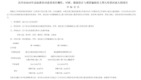 2018年4月11日,我司中標(biāo)“漢川市2018年高標(biāo)準(zhǔn)農(nóng)田項(xiàng)目”,該項(xiàng)目位于湖北省漢川市,項(xiàng)目規(guī)模約17萬畝,對漢川市2018年高標(biāo)準(zhǔn)農(nóng)田建設(shè)項(xiàng)目進(jìn)行測繪、可行性研究、規(guī)劃設(shè)計(jì)與預(yù)算編制,中標(biāo)金額為544.21萬元,中標(biāo)單價(jià)為新建1萬畝(36.68萬元)和補(bǔ)建一萬畝(26.10萬元)。