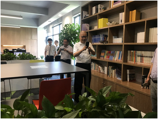 尹教授及各位來賓在我司董事長王雁然先生的陪同下,參觀了我們的辦公樓。當尹教授來到綠意盎然、滿室書香的二樓閱覽室時,還拿出手機連連拍照,每一層看完后尹教授贊不絕口,和陪同人員說:“鼎正的環境無論是硬件設備設施,還是裝修風格都領先于同行業 ”。